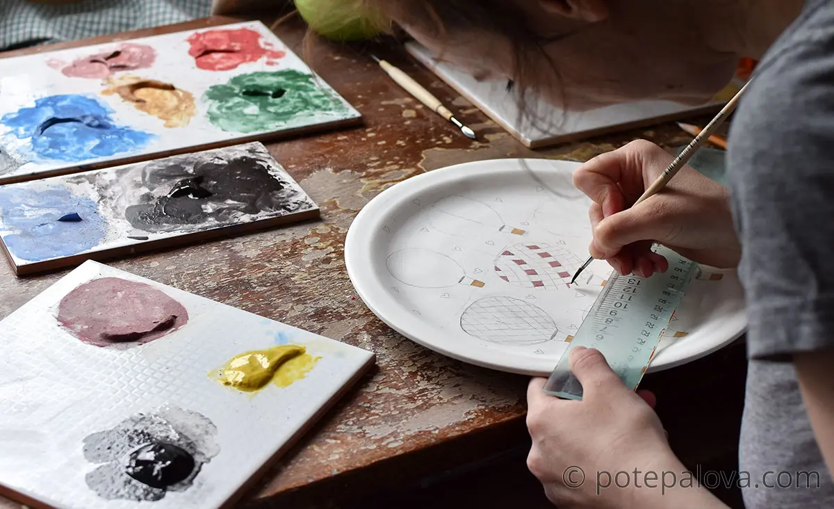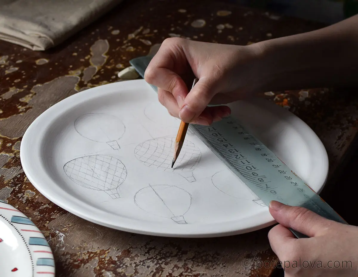 - Нет! Я их рисую на глаз. На самом деле у меня есть своя система разметки. Размечаю и чашки, и тарелки карандашом. У меня всегда был довольно точный глазомер. Мне и в "Кустодии" давали работы на графику. Мне легко давалась графика. Еще в детской студии рисования я любила графику: когда все дети хотели что-то намазать и бежать, мне наоборот хотелось проработать ровные штрихи, они меня завораживали. В жизни важно видеть конечную цель того, чего ты хочешь, а не рассматривать досконально каждый этап, чтобы не провозиться. Нас в институте еще учили: главное правило рисования прямой линии - начинать и видеть уже конечную точку, и тогда линия получается прямой. Ты рисуешь практически вслепую. Я всегда пользуюсь этим методом. Вот таким нехитрым способом у меня получается создавать прямые линии.